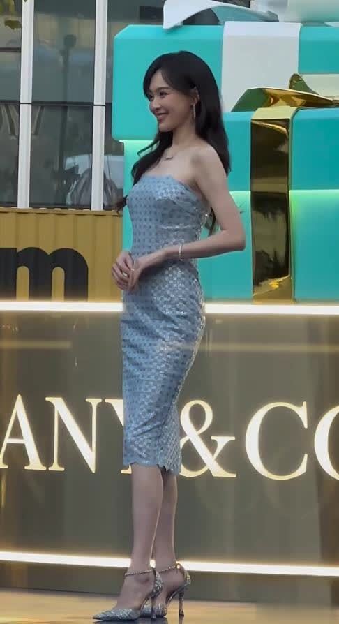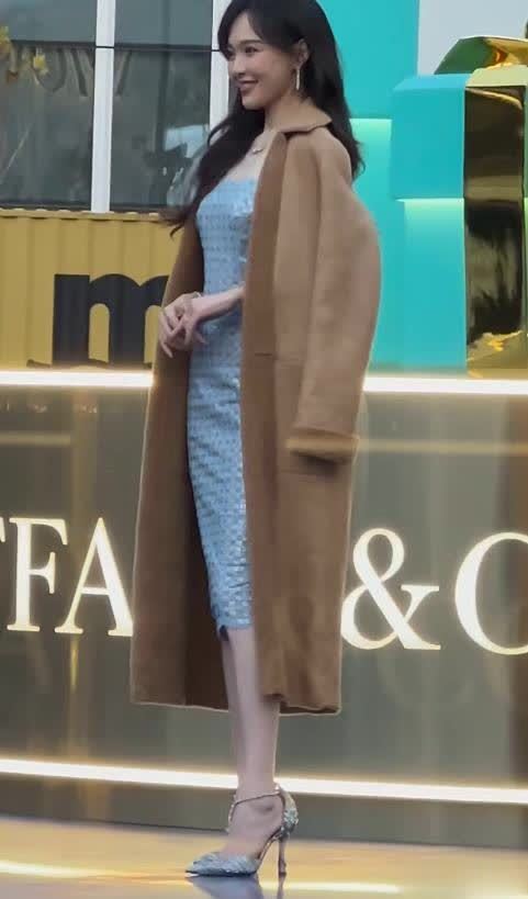 后面为了拍照还给大衣脱了,漏出了浅蓝色格子抹胸长裙,大冬天的,女明星就是抗冻。