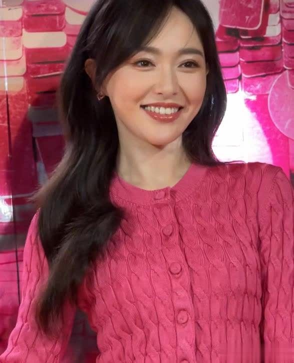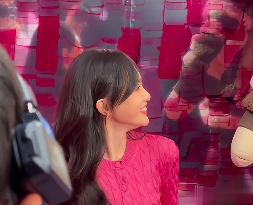 活动上她穿了一条玫红色的针织套装,发型整了一头玫红色的大波浪。