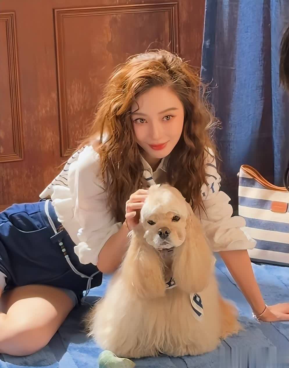 坐在露天的场地上拍照中玉束哈,还对着狗笑盈盈的。